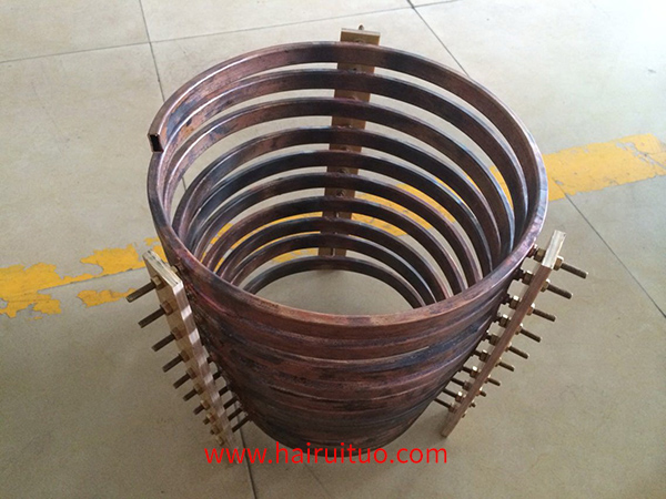 (1)感應(yīng)爐感應(yīng)圈:感應(yīng)圈是感應(yīng)爐的心血管系統(tǒng),根據(jù)感應(yīng)圈將電能變化為能量,使鉗鍋內(nèi)的金屬材料回收廢料熔化。矩形框空調(diào)銅管繞成多匝電磁線圈呈螺旋狀,表面噴漆高韌性三防漆,用絕緣帶捆扎。中頻感應(yīng)爐匝與匝之間還涂有防火平衡膠泥,感應(yīng)圈上下設(shè)有水冷散熱環(huán)。